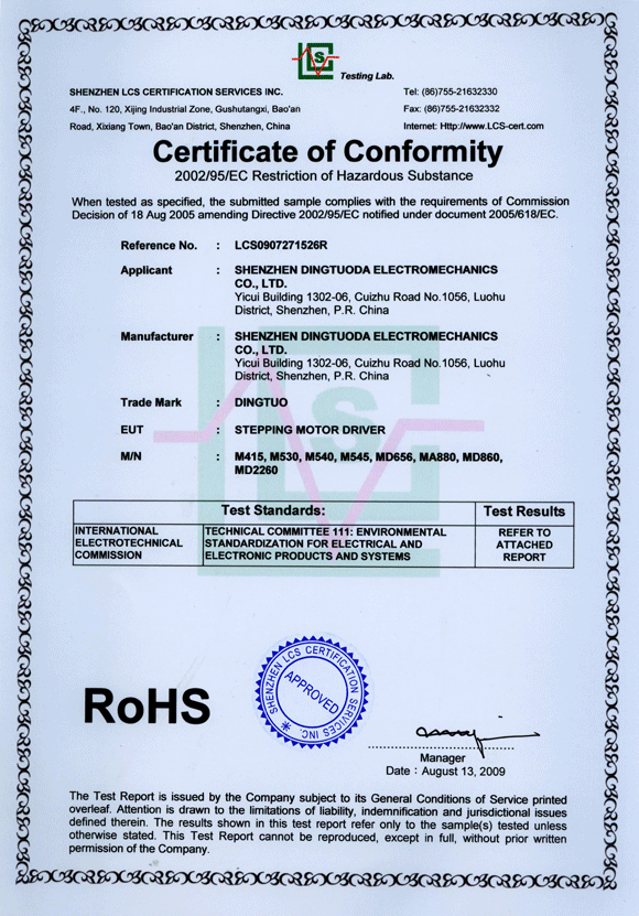 首頁->產品認證->步進驅動器RoHS認證證書